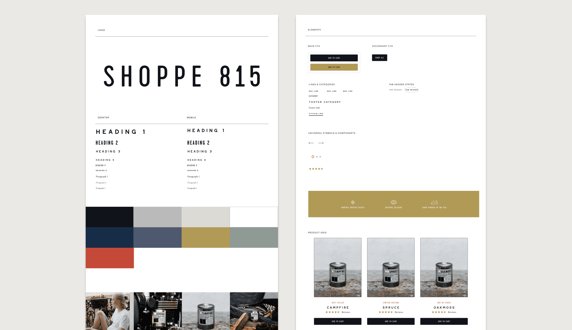 The visual guidelines reflect Shoppe 815’s adventurous, Americana-inspired identity while keeping the experience clean and elegant. Colors balance the brand palette with accessible hues, and typography establishes clear hierarchy to guide users naturally through content. Together, the system creates a cohesive, scalable design that supports both storytelling and usability.